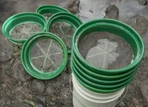 | Stackable DesignOur sifting pans are stackable, giving you the most efficiency. By resting the pans on top of one another, you are able to save space and time. Stack and store when not in use, or stack and use them at the same time. Make classification a breeze with our sifting set! They can be easily stacked on top of a 5 gallon bucket to catch the falling water.* *Bucket Not Included | Stainless Steel Wire MeshThe durable and rust resistant stainless steel mesh wire is perfect for prospecting and archeology. Easily screen off gravel and rock from your findings to locate gold and other treasures and relics. The design of our wire mesh is proven and patented, giving you a greater chance of success while panning. This valuable and unique design can not be found anywhere else! | Multiple SizesOur set features 5 different wire mesh sizes so you’ll never be without options. These sizes include: