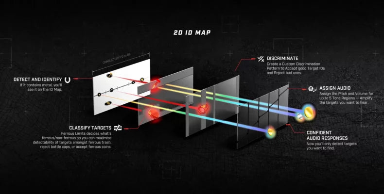Multi-IQ+ is the newest generation Simultaneous Multi-Frequency engine from Minelab, building on the success of the original Multi-IQ. Multi-IQ+ transmits more power through the coil at a wider range of operating frequencies, to light up more targets in the ground. It has completely revamped signal processing providing enhanced discrimination, greater Target ID resolution, improved target separation, and gives you a greater ability to tune discrimination and audio to suit your detecting conditions.