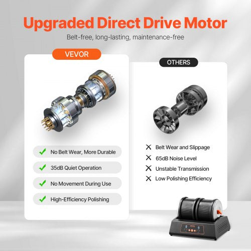 Belt-Free Direct-Drive Motor: No more worries about broken belts! The direct-drive motor delivers efficient power with 35dB silent operation. The rock tumbler runs cool even after extended use, ensuring a longer lifespan for endless rock-tumbling fun.